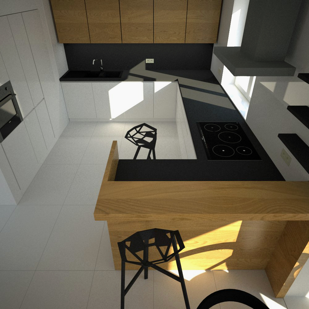 Przebudowa kuchni — tak, by była funkcjonalna. Znika ścianka — wyspa, drzwi na taras stają się oknem doświetlającym blat roboczy. Część istniejącej zabudowy wnękowej zostaje. Dodatkowa płytka szafa podręcznej spiżarni uzupełniła otoczenie stołu. Adaptacja tego co powinno zostać i uzupełnienie o konieczne elementy funkcji i światło. Dzienne.