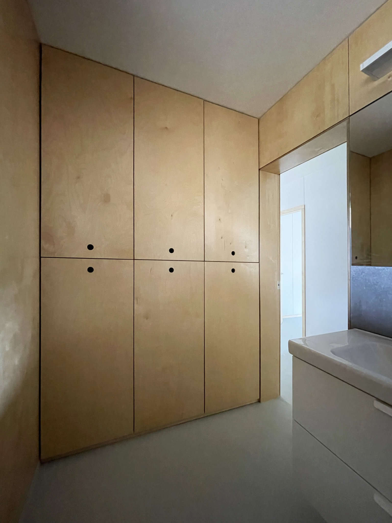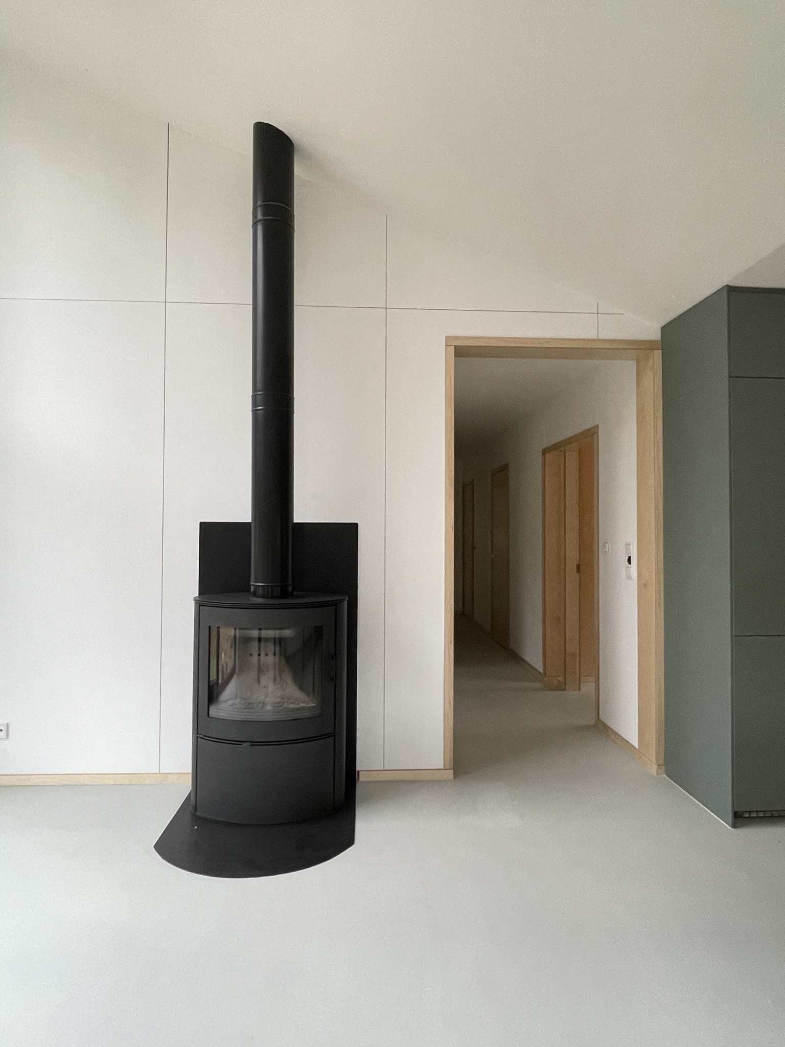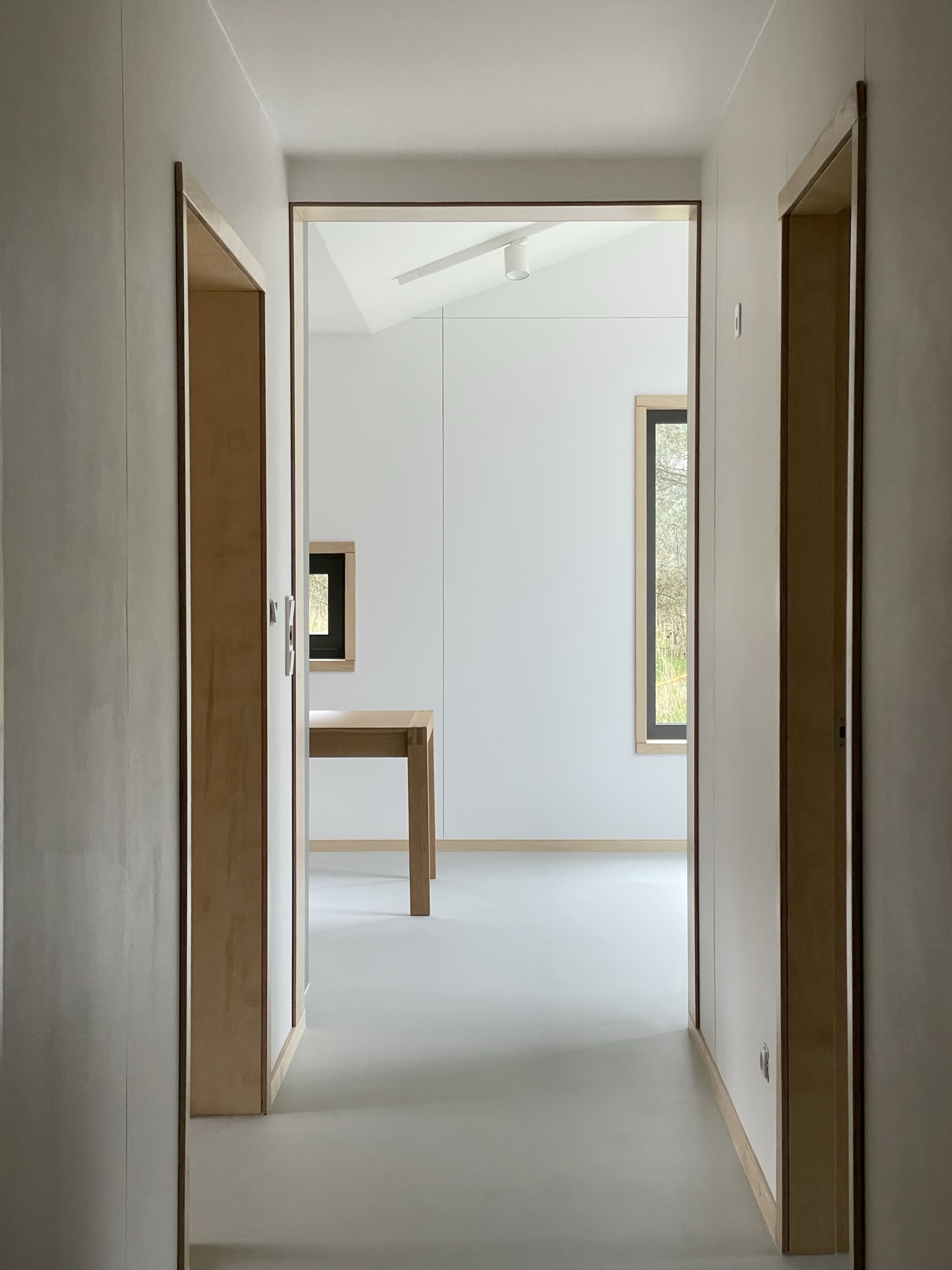 2023-4 / okolice Poznania / szkieletowy dom letniskowy z zabudową meblową i stolarką ze sklejki